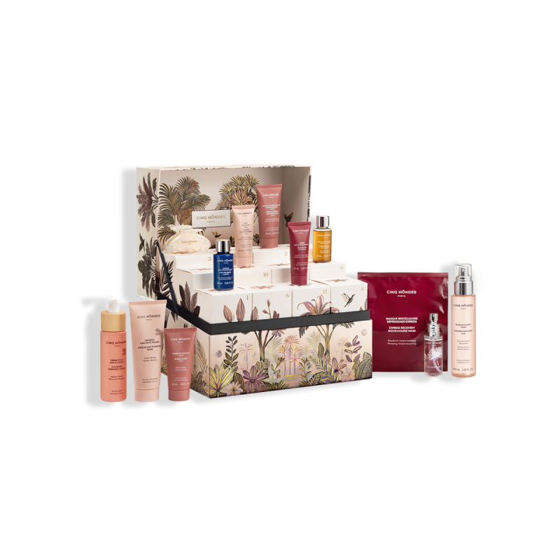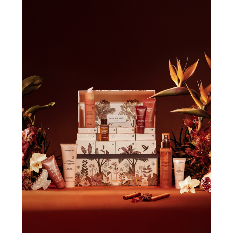 Le cadeau idéal à offrir ou à se faire offrir pour Noël ! Toute l'expertise Cinq Mondes dans un calendrier de l'Avent de 12 surprises exclusives déclinées en formats voyage et revente, et sublimée par un accessoire inédit conçu spécialement pour cette collection des pharmacopées.