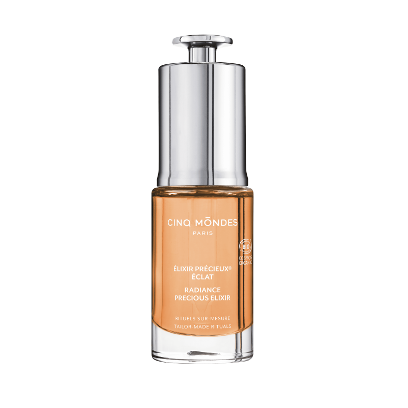 L’Élixir Précieux Éclat est un concentré puissant d’huiles 100% végétales, riches en acides gras essentiels (Omégas 3 et 6). Le duo unique d’infusions oléiques de Kémiri anti-oxydante et de Papaye booster d’éclat, utilisées traditionnellement à Bali pour l’éclat de teint, est associé au complexe Retinoid-like pour accélérer en douceur l’exfoliation naturelle de la peau. La peau est plus lumineuse, elle retrouve son éclat originel. Son parfum frais, énergisant, aux notes hespéridées et d’Ylang-Ylang, telle une goutte de rosée des forêts balinaises, éveille l’esprit. À utiliser en association avec la Crème éclat aux 5 Fleurs pour une mine encore plus radieuse.