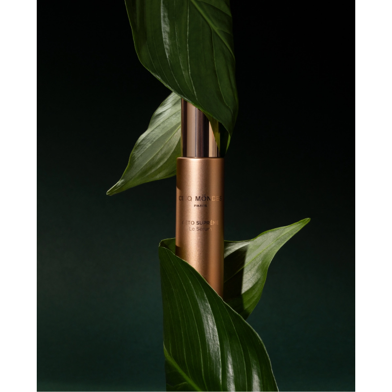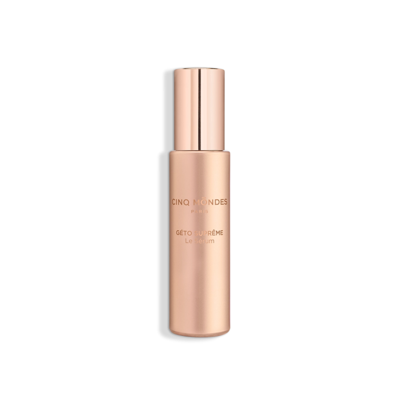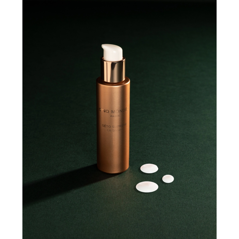 GÉTO SUPRÊME LE SÉRUM, dernière innovation des Laboratoires Cinq Mondes, est un concentré ultime des bienfaits de la « plante de longue vie » originaire d’Okinawa pour corriger tous les signes de l’âge. Il bénéficie d’une concentration maximale en extrait de Géto Bio, dont les extraordinaires propriétés de régénération cellulaire ont été scientifiquement prouvées dès 7 jours d’application*.